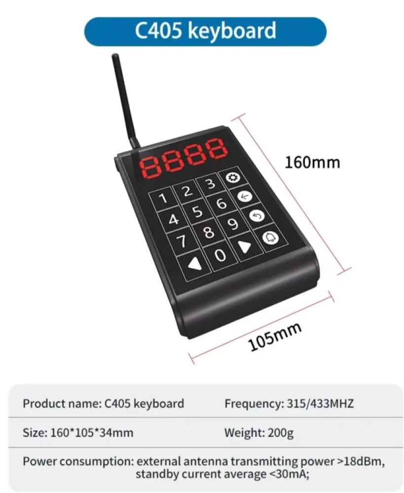 - شاشة LED بثلاثة أرقام، يمكن توسيع جهاز إرسال لوحة المفاتيح 999 قناة إلى أقصى حد للعمل مع جهاز استقبال 999. يمكنك دائمًا إضافة المزيد من أجهزة التوجيه إلى النظام مع نمو عملك.