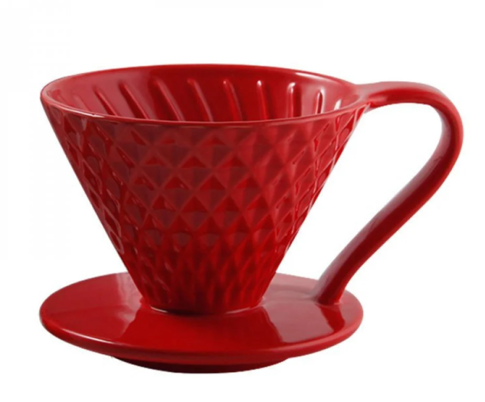 قمع سيراميك للتقطير قادر على تحمل أعلى درجات الحرارة، ويستطيع الاحتفاظ بها كي لا تبر القهوة أثناء التحضير، يتميز قمع V60 بانحناءاته المائلة من الداخل لاستخلاص كامل لنكهات القهوة.